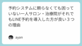 一人サロン・個人サロン向けに、LINE上で自動予約受付が可能なチャット予約システムを開発・運用しています、Ayan(えーやん)と申します。